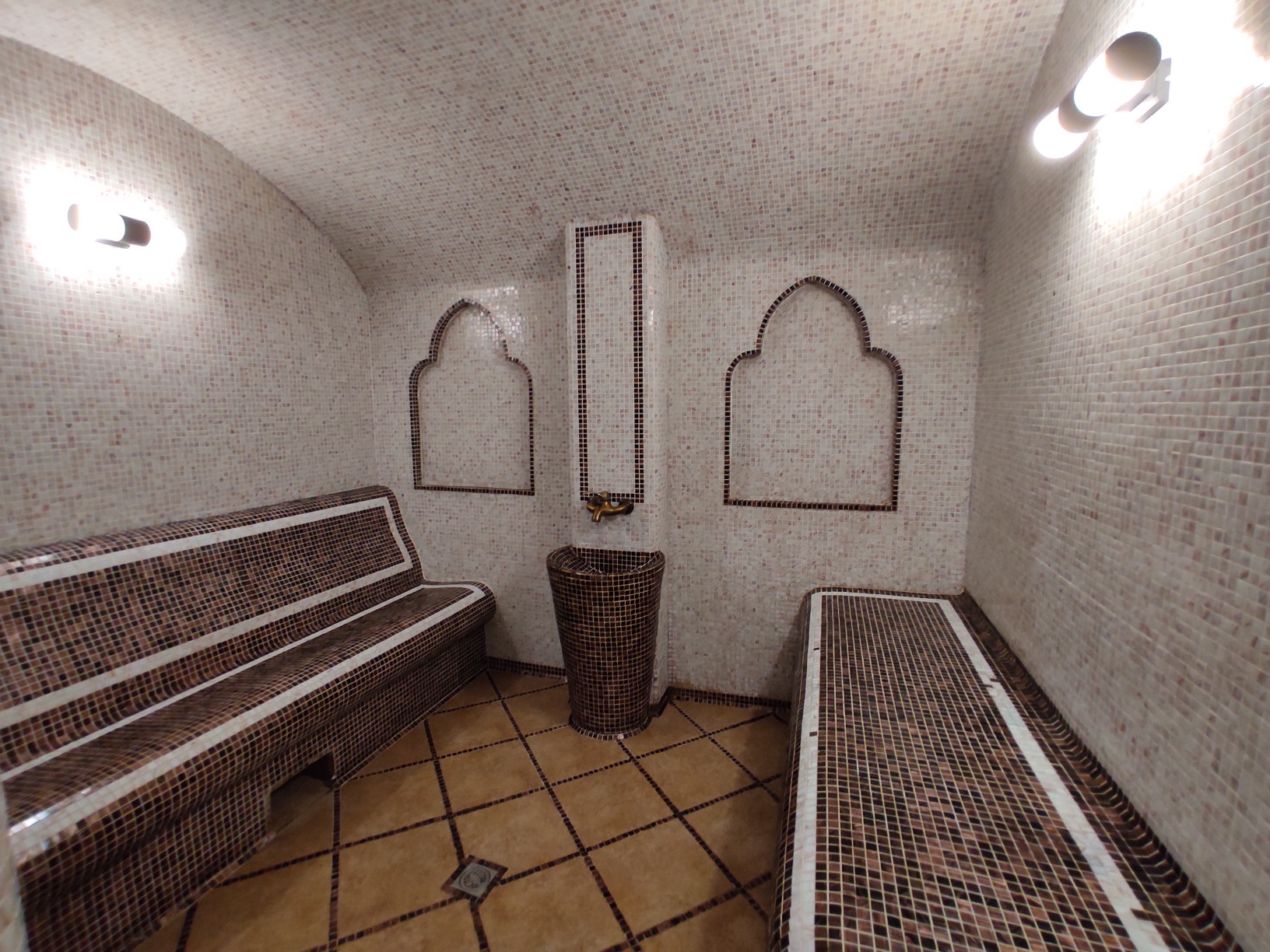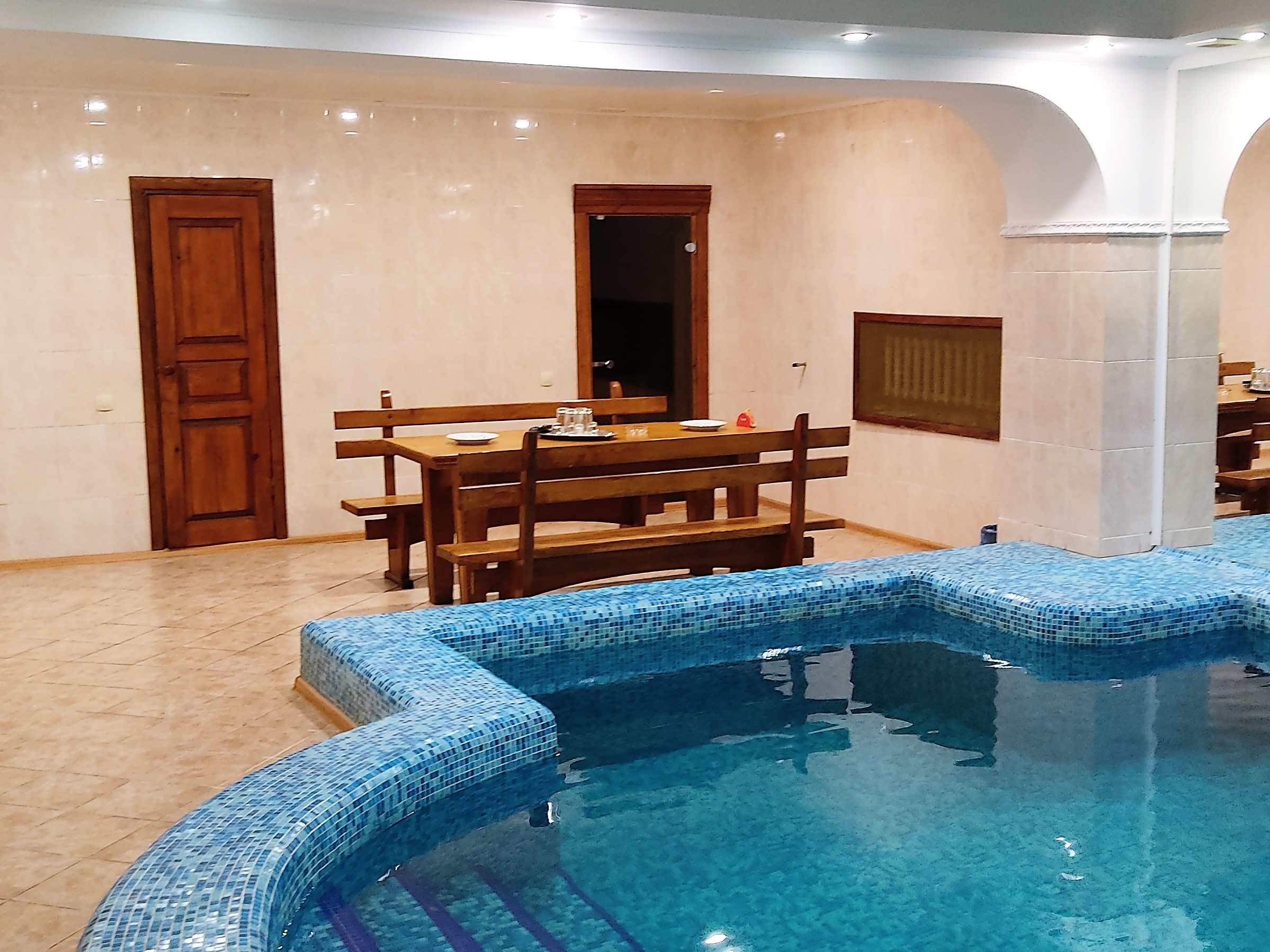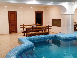 Сауна "Турецкая" с двумя парными - турецкая (хамам) и финская , большим бассейном и комнатой отдыха.